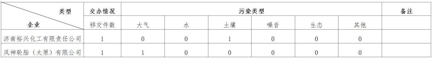 10月28日,中央第七生态环境保护督察组向九游官方网站-九游jiuyou(中国)转办第二批群众信访举报件2件(来电举报0件,来信举报2件)。从信访举报件中的生态环境问题类型来看,涉及大气1件、水0件、土壤1件、噪音0件、生态0件、其他污染0件。从企业分布上看,济南裕兴化工有限责任公司1件、风神轮胎(太原)有限公司1件。