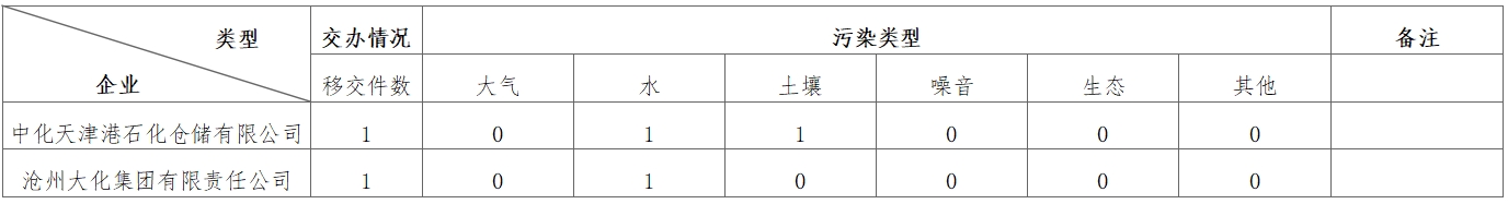 11月19日,中央第七生态环境保护督察组向九游官方网站-九游jiuyou(中国)转办第七批群众信访举报件2件(来电举报0件,来信举报2件)。从信访举报件中的生态环境问题类型来看(一件举报可能涉及多种问题类型),涉及大气0件、水2件、土壤1件、噪音0件、生态0件、其他污染0件。从企业分布上看,中化天津港石化仓储有限公司1件、沧州大化集团有限责任公司1件。
