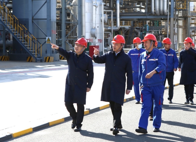 在沧州大化,王舸一行参观了控制中心、PC、TDI及双酚A等生产装置,深入了解企业生产经营和科技创新工作情况。王舸强调,要深入学习领会党中央关于全面从严治党的重大战略部署,不断提高政治站位,扎实履行“两个责任”,切实抓好党组巡视反馈问题整改,积极营造风清气正的政治生态,发挥党建引领保障作用。要坚定信心、坚守定位,不断提升基础管理水平,大力推进化工新材料领域科技创新,切实扛起打造中国中化高质量产业发展基地的使命责任。