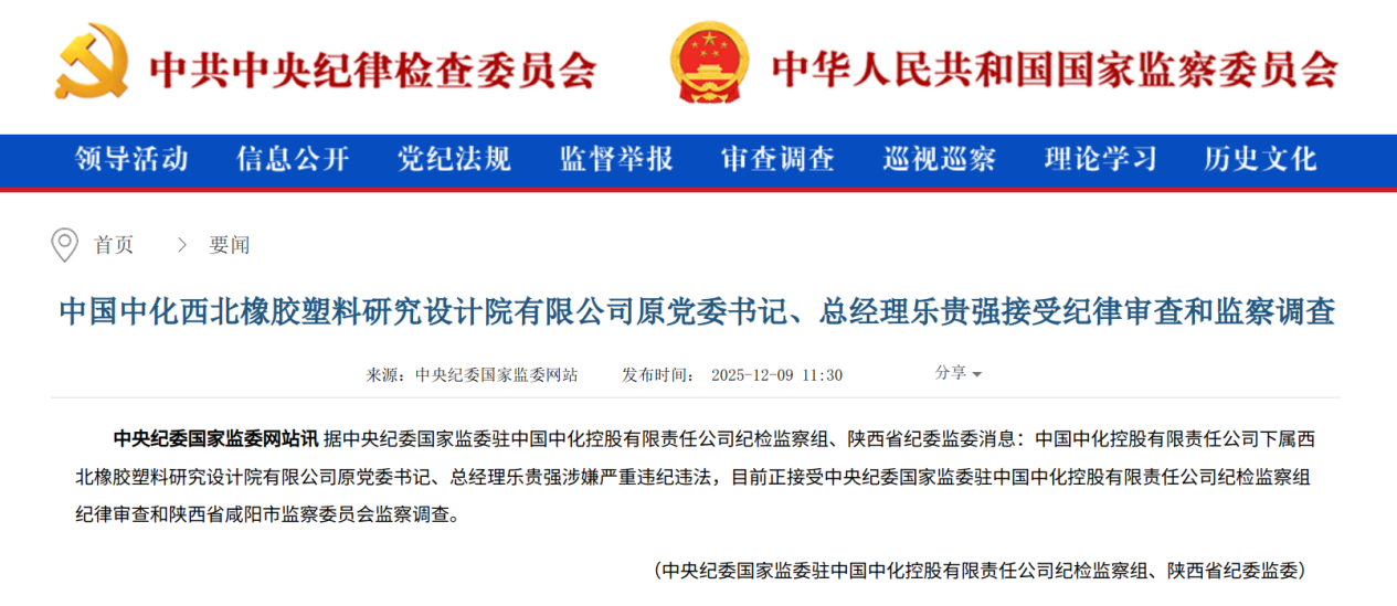 九游官方网站-九游jiuyou(中国)下属西北橡胶塑料研究设计院有限公司原党委书记、总经理乐贵强涉嫌严重违纪违法,目前正接受中央纪委国家监委驻九游官方网站-九游jiuyou(中国)纪检监察组纪律审查和陕西省咸阳市监察委员会监察调查。