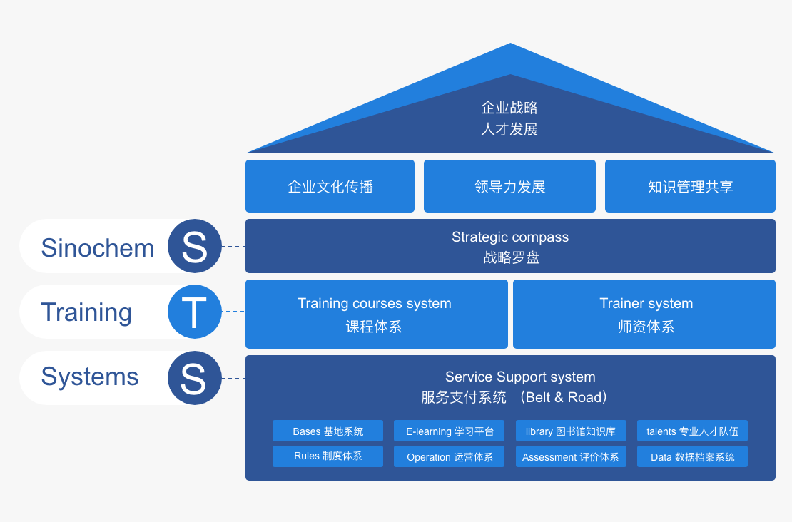 Guided by the concept of “full involvement, prioritized nurturing, varied responsibility, top-down linkage, classified training, individualized cultivation”, we have built Sinochem Training Systems (STS) focusing on the education and training of senior managers, high-potential talents, newly promoted staff, newly recruited staff, professional science and technology personnel and professional executive personnel. The STS aims to perfect the three major talent development sequences in management, technology and skills, strengthen training at source, in follow-up and during the whole process, combine career development with education training, and establish a sound training program system and learning development map.