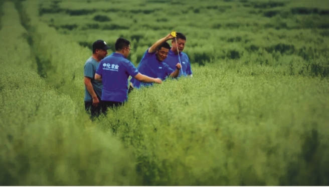 MAP农艺师与阿旗种植户在查看作物长势 2013年以来,中国中化定点帮扶阿旗。2019年,先正达集团中国MAP技术服务中心落地阿旗,运用现代农业科技带动农户种植观念和方式的转变升级,并探索面向市场的运行和服务模式。