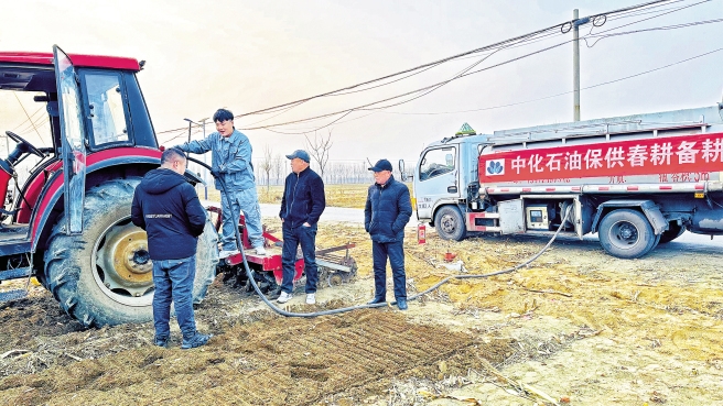 浙江、湖南等地中化加油站将农耕用油供应放到首要位置,开通春耕用油“绿色通道”等专项优惠加油服务,确保春耕用油保供“不误时”。天津石油跟踪了解农户用油需求,制定灵活的“一户一议”配送方案,实际解决农户农忙加油难问题,确保24小时油品配送服务直达田间。图为中化天津石油员工为春耕旋耕机加油。