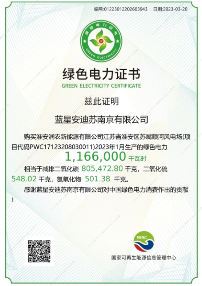 安迪苏南京工厂获国家级“绿色电力证书” |