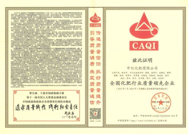 继连续多年入选“全国质量诚信标杆企业”称号后,近日,中化化肥凭借优质的产品和服务质量,再次斩获中国质量检验协会颁发的“全国化肥行业质量领先企业”“全国质量检验稳定合格产品”两项殊荣。 作为一家集研发、生产、销售、服务于一体的农资企业,中化化肥始终将质量放在首位,以高品质的产品与服务助力广大种植户增产增收。下一步,中化化肥将继续践行“质量先行、品质为本”理念,把好质量关,以最优质的作物营养产品服务广大农民和农业从业者,为积极助力中国农业现代化转型、实现中国农业绿色可持续发展、建设农业强国贡献力量。