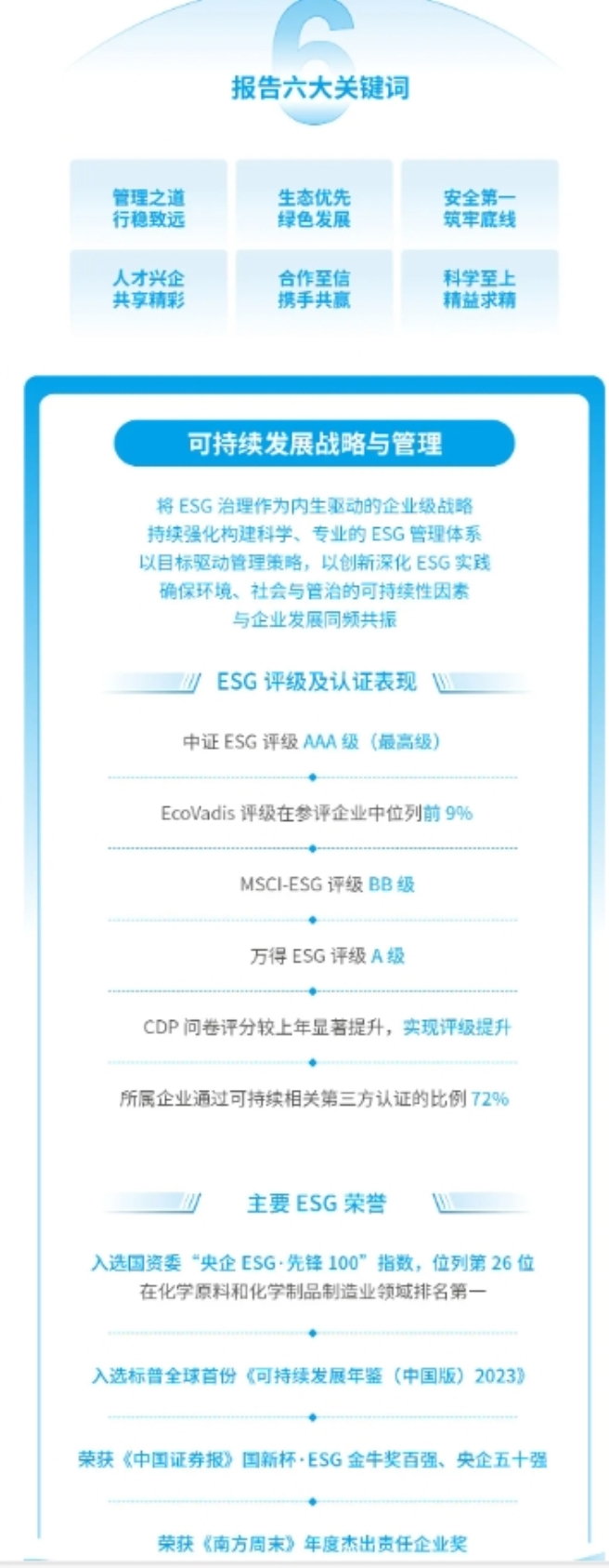 目前,E(Environmental环境)S(Social 社会)G(Governance 治理)逐渐成为企业高质量可持续发展的重要衡量指标。中国中化坚定履行企业公民责任贯彻落实新发展理念,坚持绿色发展、循环发展、低碳发展,建立完善的环境、社会责任和公司治理体系。近日,中国中化旗下中国化际发布2023年ESG报告。