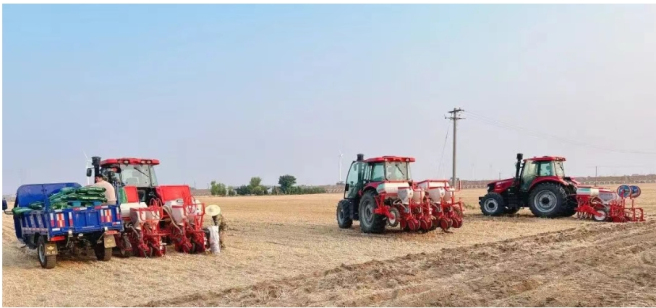 在浙江省平湖市的中化农业MAP农场,丰收场景同样喜人——当地麦田亩产达到1090.4斤。卫星遥感扫描苗情、无人机巡田除虫、物联网墒情监测构成“天-地-空”矩阵,赋能种植户为麦田提供全方位精细养护,筑牢江南鱼米之乡的粮仓根基。 先进设备 让夏种夏管更“智慧 玉米播种,分秒必争。收割机的轰鸣声尚未远去,播种机的履带已轧出新痕。中化农业MAP河南温县中心采用“农机+农技”双管齐下的策略,显著提升夏种、夏管效率。温县中心跨区域调拨6台播种设备同时作业,先进农机较普通机械效率提高一倍,仅用10余天就完成6000余亩玉米地的全部播种,较计划提前一周,出苗时间也较往年提早10天。同时,温县中心为服务玉米地块配套铺设水肥滴灌设备,对比传统漫灌及大喷灌,滴灌分区作业每日可浇灌35至40亩,灌溉效率显著提升。