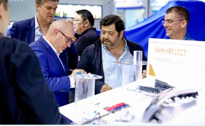 展会现场,克劳斯玛菲通过领菲®precisionMolding 320全电动注塑机结合RimStar发泡设备,协同中国中化旗下其他企业提供的原材料,现场演示ColorForm模内上漆工艺生产表面饰板,引来众多观众驻足参观。