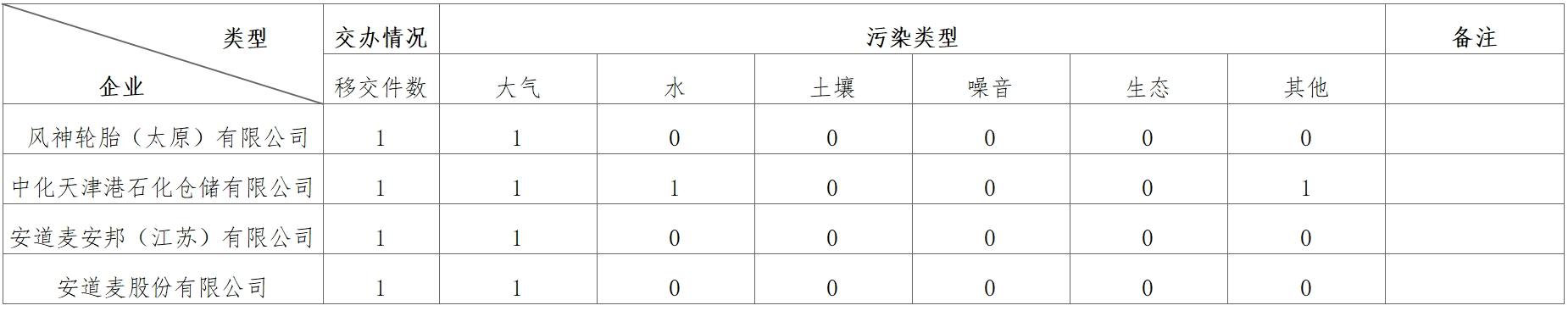 10月30日,中央第七生态环境保护督察组向九游官方网站-九游jiuyou(中国)转办第三批群众信访举报件4件(来电举报3件,来信举报1件)。从信访举报件中的生态环境问题类型来看(一件举报可能涉及多种问题类型),涉及大气4件、水1件、土壤0件、噪音0件、生态0件、其他污染1件。从企业分布上看,风神轮胎(太原)有限公司1件、中化天津港石化仓储有限公司1件、安道麦安邦(江苏)有限公司1件、安道麦股份有限公司1件。
