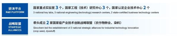 中化集团实施创新驱动发展战略,努力以科技进步促进企业战略转型,在农药、氟化工、染颜料等领域形成了较强的研发能力。近年来,中化集团相继被评为国家“创新型企业”、国家“海外高层次人才创新创业基地”以及首批国家级知识产权示范企业等。公司“环境友好五元环含氟材料催化合成技术及产业化”项目获2017年度国家技术发明奖,实现中化集团近十年来在国家最高层次科技奖励上的突破。