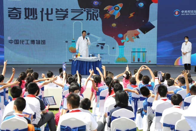以“热爱科学 崇尚科学”为主题的2023中关村论坛配套户外高端科普活动于5月26至27日在北京市海淀公园举办。中国化工博物馆百年图片展、化学表演秀、化博文创、科普实验等4个项目亮相本次活动。图为学生们与化学表演秀的老师积极互动。
