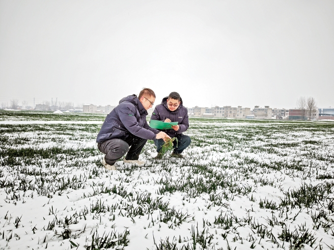近日,龙年首场寒潮来袭,全国大部分地区出现降温、冰冻、暴雪天气,给农业生产特别是春耕工作带来不利影响。中化农业 MAP 农艺师们不畏严寒,冒雪在田间地头查看土壤墒情、小麦苗情,针对当前春耕重点及追肥除草等需求为服务农户制定春管方案。