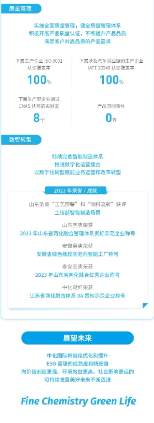 目前,E(Environmental环境)S(Social 社会)G(Governance 治理)逐渐成为企业高质量可持续发展的重要衡量指标。中国中化坚定履行企业公民责任贯彻落实新发展理念,坚持绿色发展、循环发展、低碳发展,建立完善的环境、社会责任和公司治理体系。近日,中国中化旗下中国化际发布2023年ESG报告。