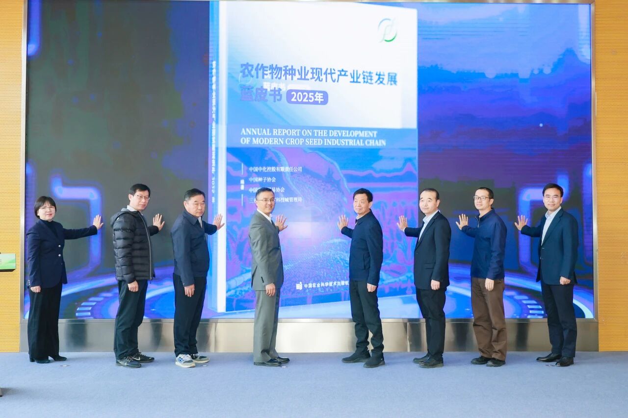 ★ 在研发环节,中种集团通过企科联合方式开展“揭榜挂帅”,聚焦行业关键核心技术和产品集中攻关,共挖掘与测试基因46个,申请专利28项,申请植物新品种权12件,登记果蔬新品种5个,审定大田作物品种14个,推动一批种业创新成果更快、更高效地走向生产一线、走进农户; ★ 在育种环节,累计向行业共享优异亲本材料超过300份,联合组配新杂交种开展测试360个; ★ 在生产环节,与地方政府共建国家制种基地,带动制种产业升级,共建“制种大县”16个; ★ 在推广环节,与合作伙伴共同维护市场秩序,健全多维度全链条种子知识产权管理体系,并依托中化现代农业服务中心推进“良种+良法”综合解决方案,服务面积超5000万亩。 随着生物育种产业化落地进入快车道,中种集团聚焦生物育种新兴产业推进产业链建设,通过领先性状带动中小企业协同发展,累计为150余家中小企业提供品种转育服务。 同时,中种集团围绕补齐产业链短板弱项,加强供应链能力建设,共建基因验证和测试网络,并与崖州湾国家实验室协同推进科研成果转化,最大验证通量达到200个载体/年。在种业研发关键试验ELISA(酶联免疫吸附)方面,与国内专业公司合作开发自动化设备1套,单日通量可提升5倍。 发布2025蓝皮书? 聚焦产业链创新实践 会议正式发布了《2025年农作物种业现代产业链发展蓝皮书》(以下简称《蓝皮书》)。该蓝皮书由中种集团发起并牵头编制,自2023年首发以来,已形成年度发布机制,由中国中化、中国种子协会、中国种子贸易协会、三亚崖州湾科技城管理局等单位共同参与编审。2025年版为该蓝皮书连续发布的第三版。